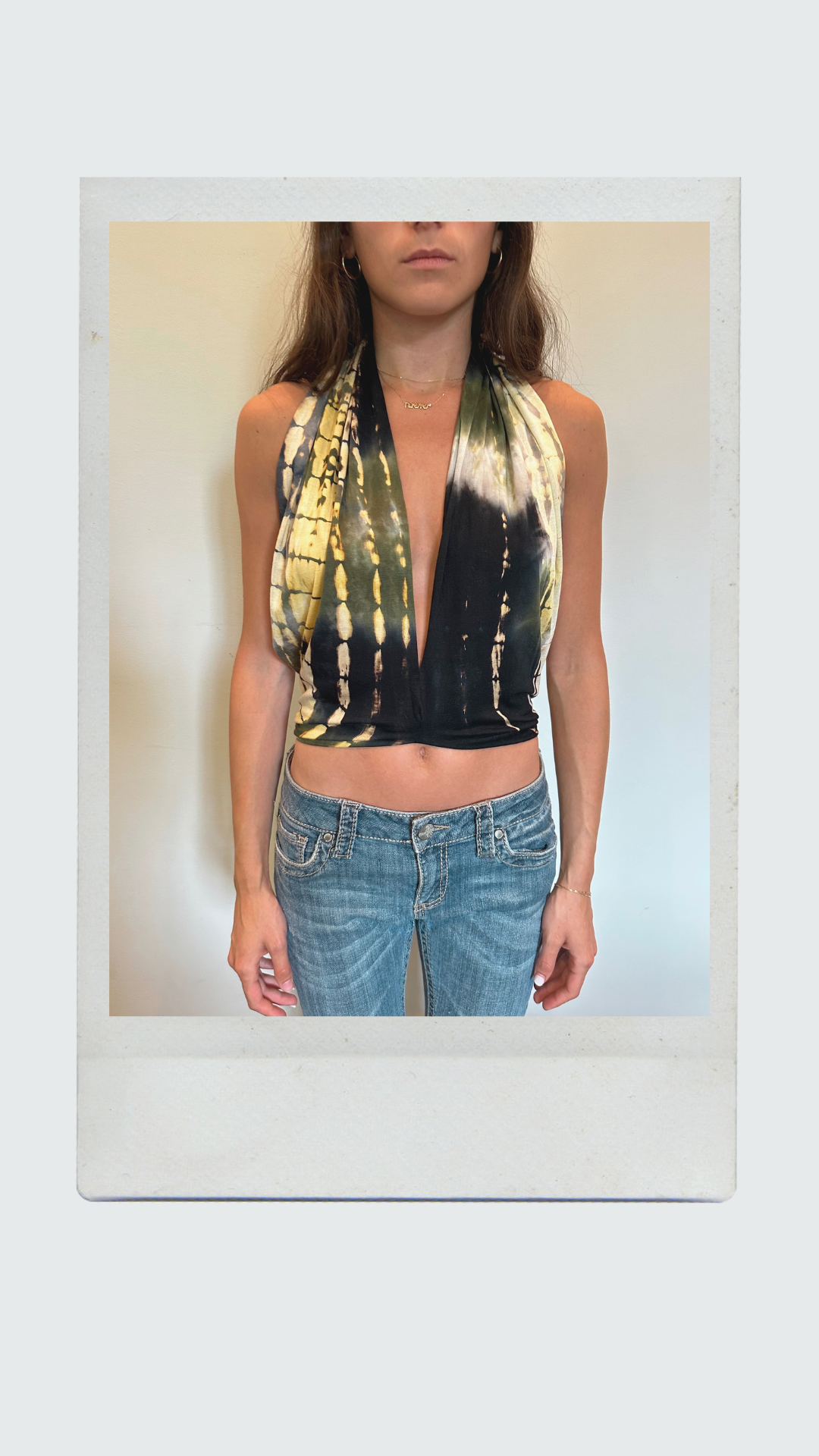 Bold, sexy, and effortlessly cool—this deep plunge halter is your new statement staple. With a sleek drape and open back, it's made to turn heads while staying light and breathable. It gives that elevated touch, whether you're headed out or dressing up denim. Made from a soft, fluid blend (93% polyester, 7% spandex), it moves with you and flatters all the right places. One size fits most (best for S–M /adjustable tie-back fit).